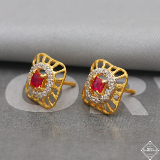 22k Yellow Gold Earrings Round Square Unique Handmade Indian 22kt Gold Stud Red Pink White Stone Earrings Jewelry for Gift, K5142