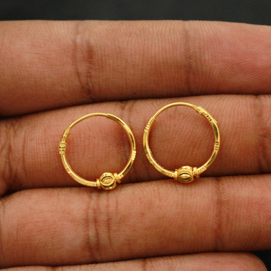 Pure 22k Yellow Gold Hoop Bali Earrings, Huggies, Beads Handmade gold earrings for women, Christmas gift, dainty Indian gold earrings