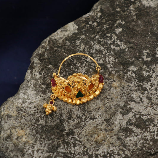 Stone 20k Yellow Gold Hoop Nose Ring Nath , Handmade big Yellow gold earrings for women, Vintage antique design indian gold nosering