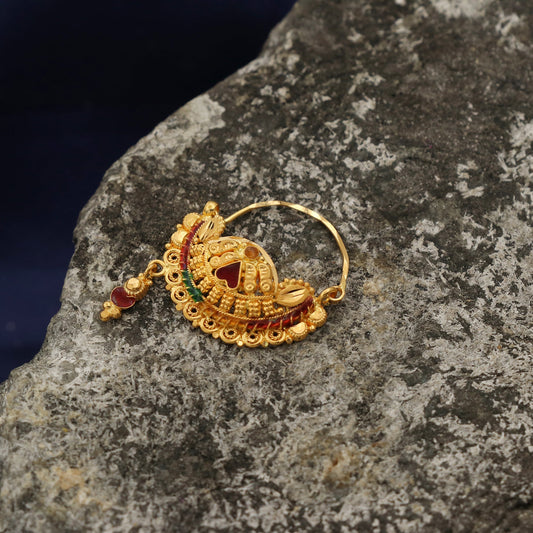 Peacock 22k yellow gold nath, nose jewelry, nose nosering, vintage antique indian gold jewelry, wedding traditional ornaments, K2251