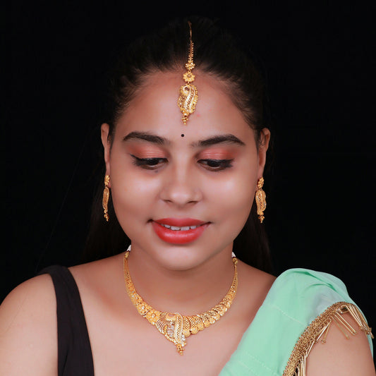 22k Yellow Gold Necklace Earrings Set Jewelry with mang tikka , Vintage Antique Handmade Indian Gold Jewelry Set, Wedding Anniversary gift