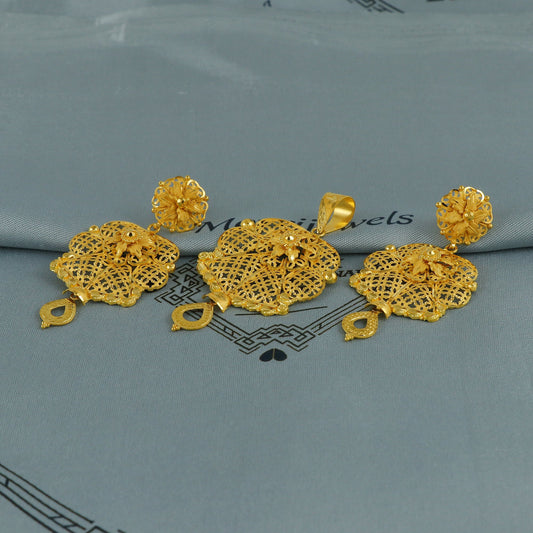 22k gold dangle filigree earrings pendant set jewelry women, pure gold flower design handmade handcrafted gold jewelry, K6744