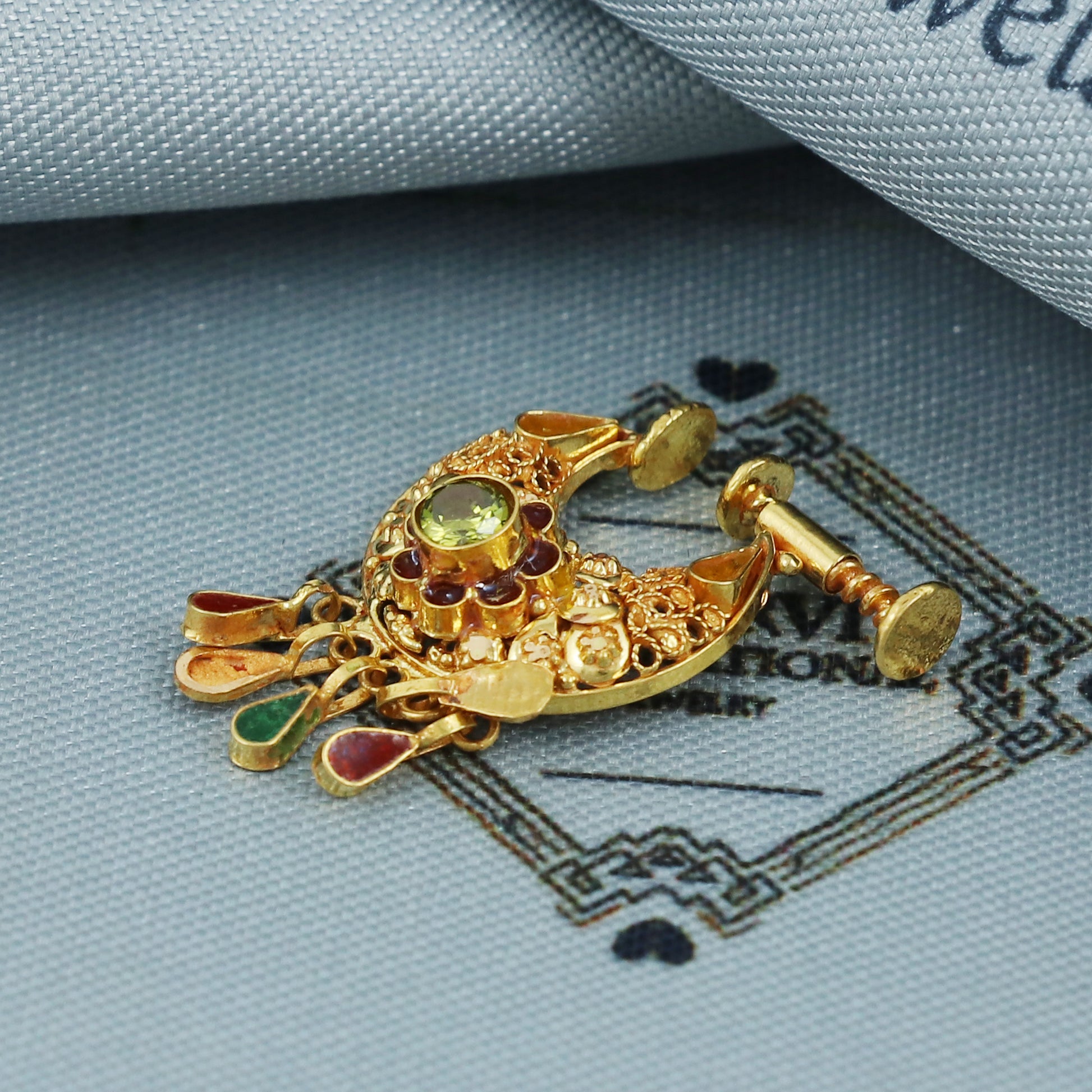 This exquisite 22k gold nath (nose ring) is a beautiful piece of traditional Indian jewelry, perfect for special occasions or as a statement accessory. Weighing 2.16 grams, this nath measures 2.3 cm by 1.4 cm, offering a delicate and elegant design. Handcrafted from pure gold, this nose ring combines cultural heritage with timeless beauty.